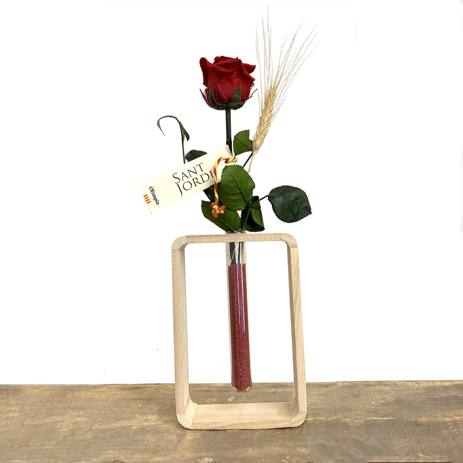 Composición de una rosa natural preservada con espiga montada sobre un marco de madera con una probeta de cristal rellena de arena roja.