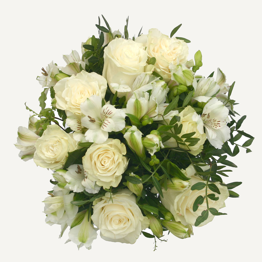 Ramo de flores compuesto por rosas blancas y tallos de alstromelia del mismo color combinado con verdes de temporada.