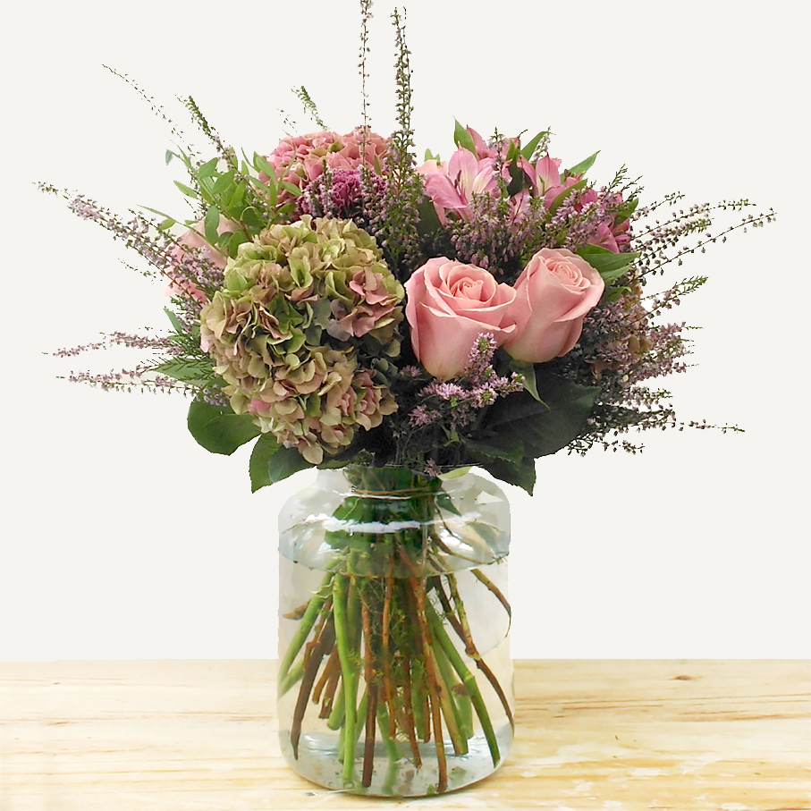 Magnífico ramo compuesto de flor natural variada como hortensia, rosas, alstromelia y claveles. Ramo de mucha presencia, elegante, con una composición equilibrada y llena de color, en tonalidades rosadas. Un ramo romántico con mucha luz ideal para decorar cualquier espacio.