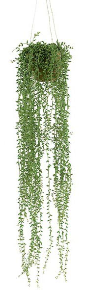 Senecio verde con maceta. Enredadera artificial de hojas matizadas, especialmente apropiada para la decoración de cestas colgantes. Su altura es de 77 cm.